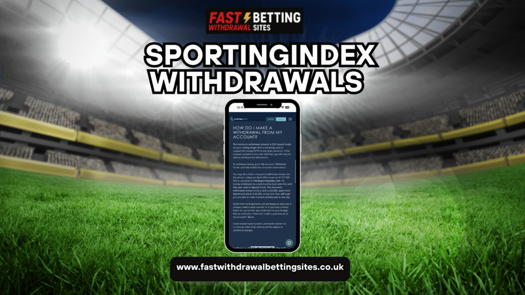 Sporting Index processes withdrawals within 24 hours and supports fast UK debit card and bank transfer payouts. All withdrawals are subject to KYC and bonus clearance policies.
